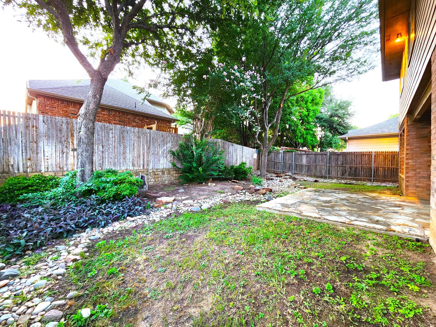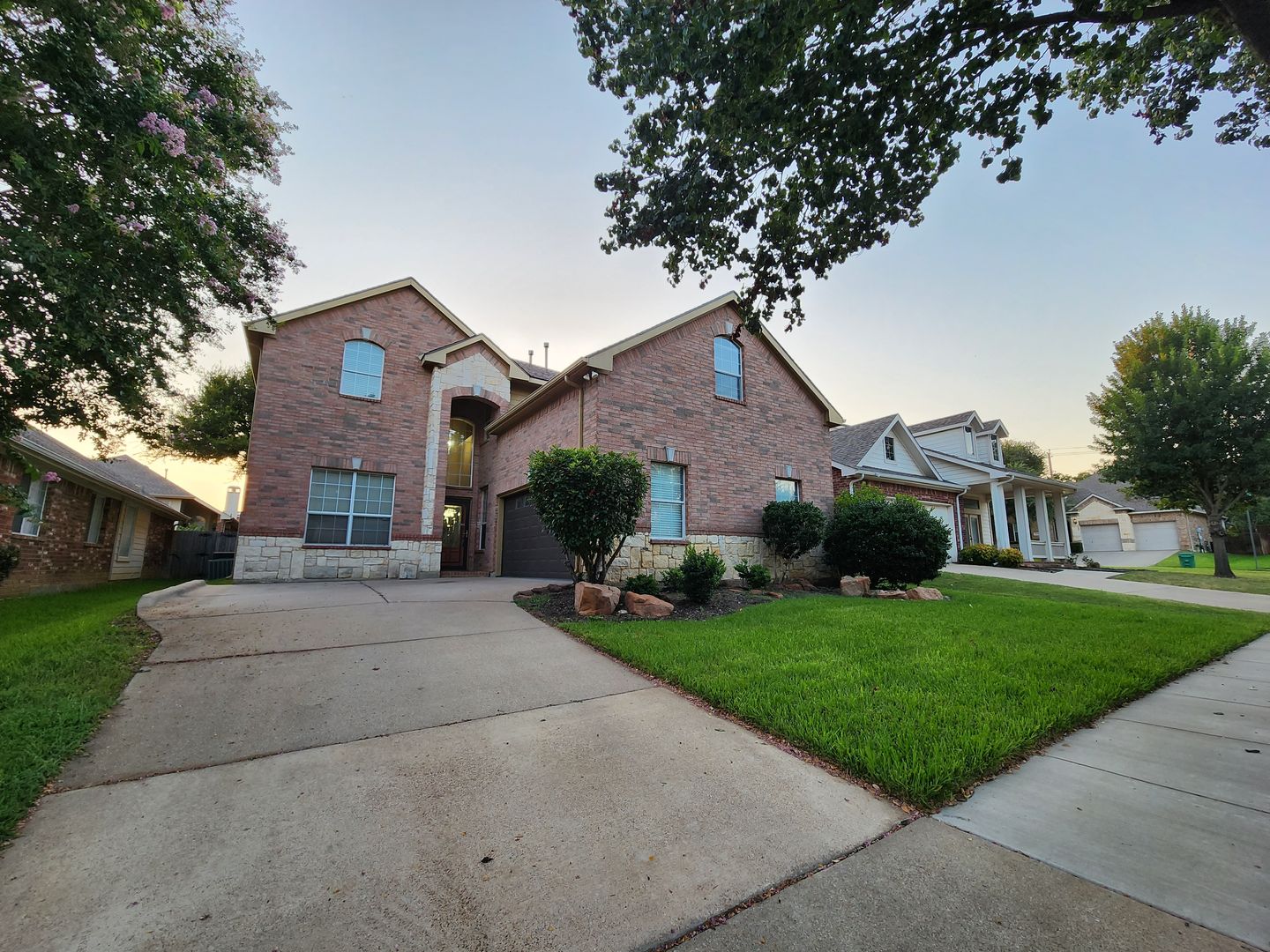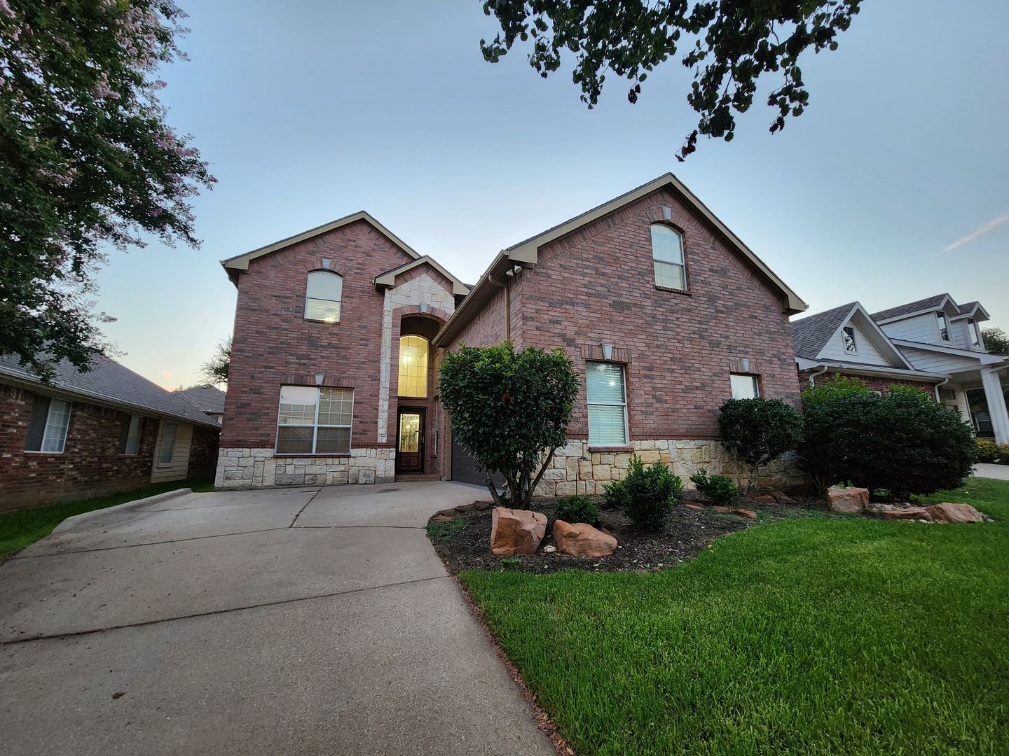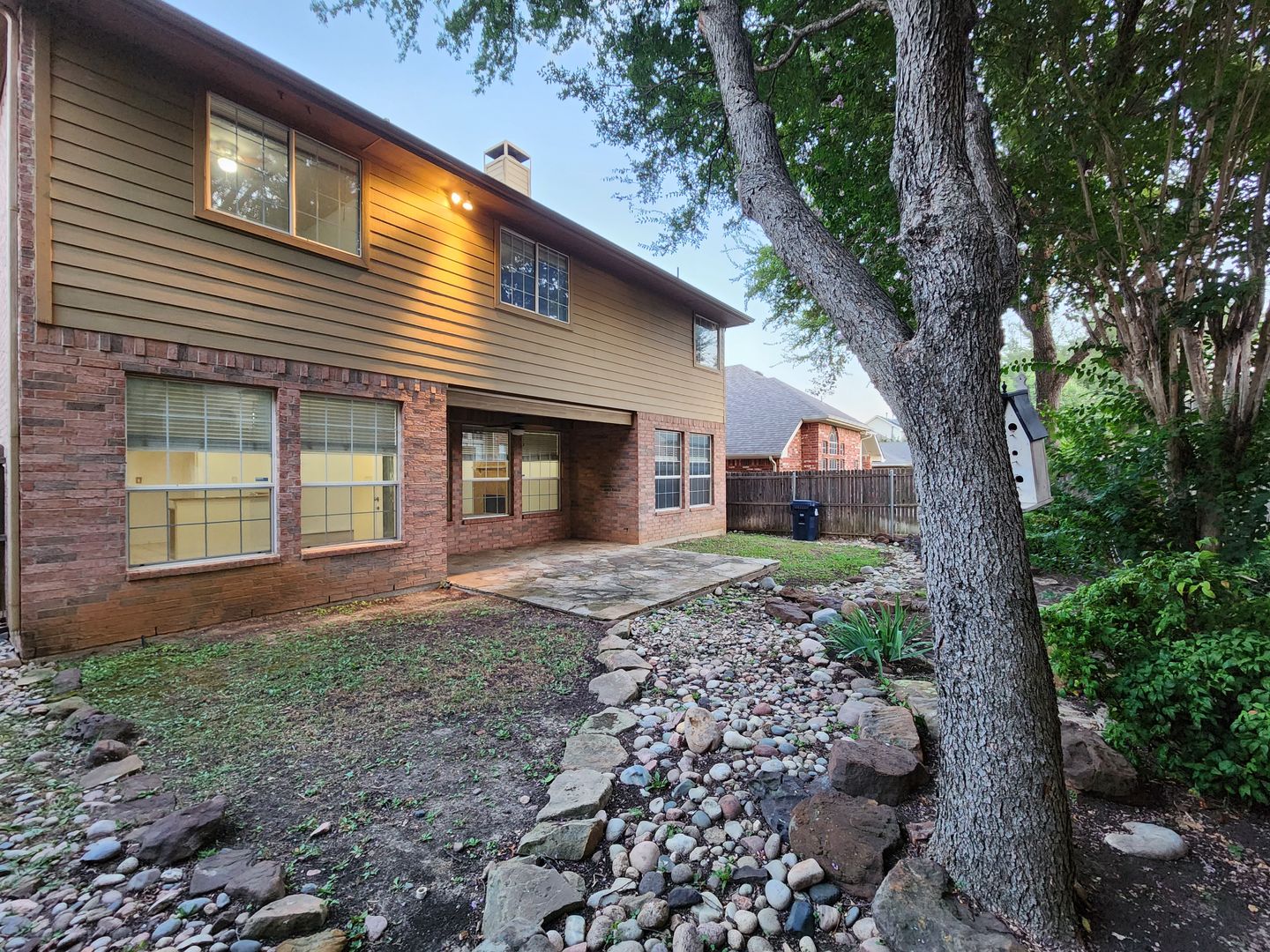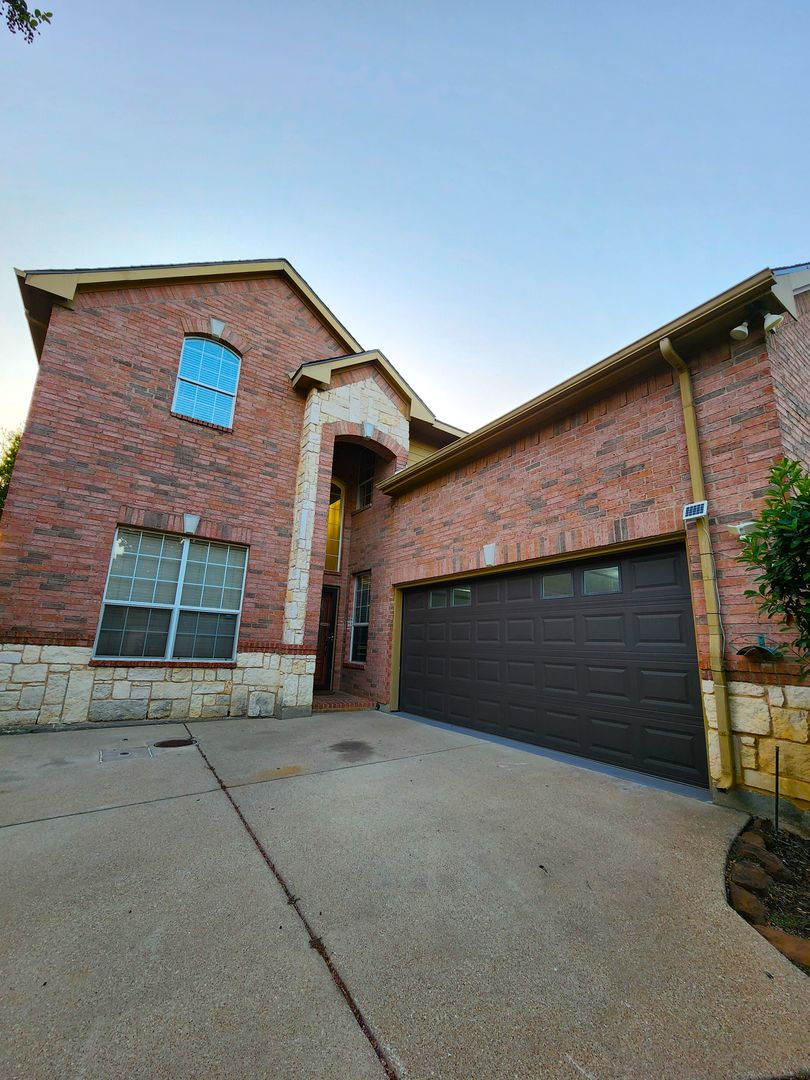 Huge 5 Bedroom home with 3 Full Baths! Enter this home and find your own space. 2 Bedrooms down, 3 Huge bedrooms up, plus an amazing Game room that would be a lego, craft, or gamer's dream. The fireplace & kitchen backsplashes are done with custom semi precious stones & fossils. Granite counters, Stainless Steel appliances, open floorplan with room for everyone. Stone patio with partial cover & lots of shade in the back. River rock decorates in a winding fashion around the trees. Finished out garage with workbench & peg wall. Upstairs has the game room, another huge living room, a small study, but what tops it all is the gigantic primary bedroom. It's like 2 rooms in one! The bathroom & closet are quite a good size as well. With close proximity to I35 on the south side of Denton, you can get anywhere you need in quick order. Easy online application. Pets ok. Students ok. Oct 1 move in.